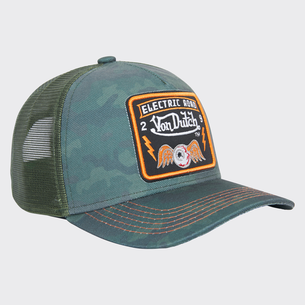 Os icônicos bonés Von Dutch Originals estão de volta. Modelo estilo trucker na cor militar camuflado, possui aba curva.